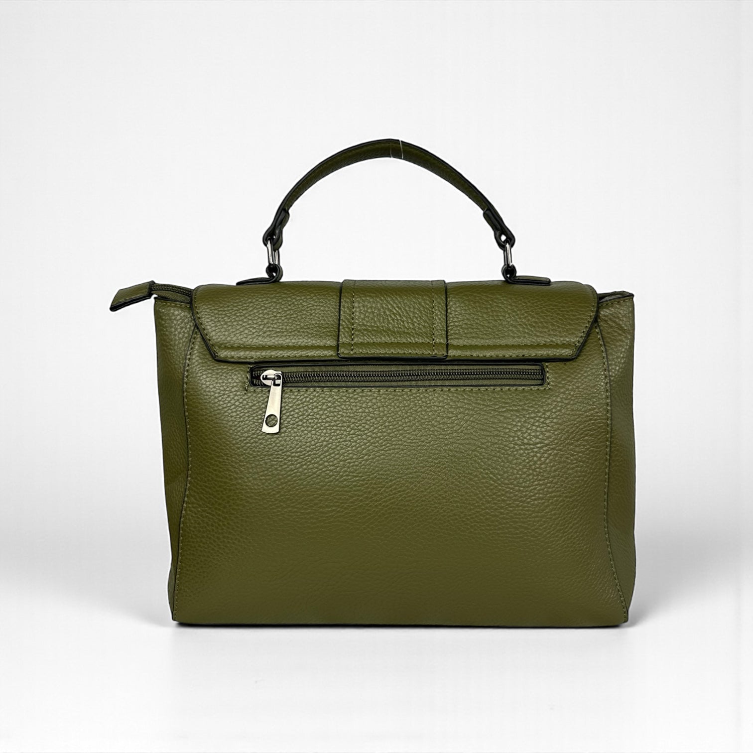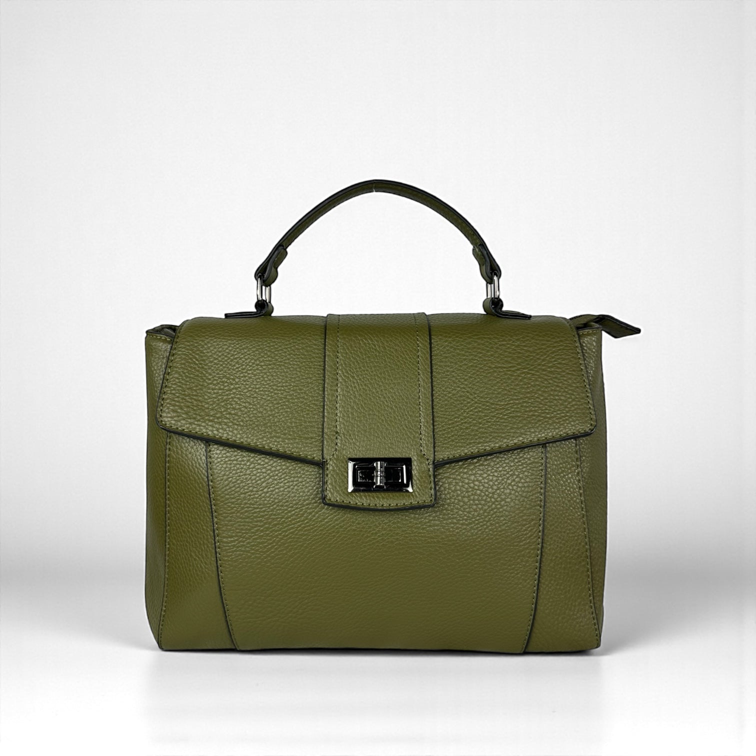 Design: Struttura rettangolare con manico superiore. Chiusura a patta con fermaglio girevole. Linee pulite e profili tono su tono.