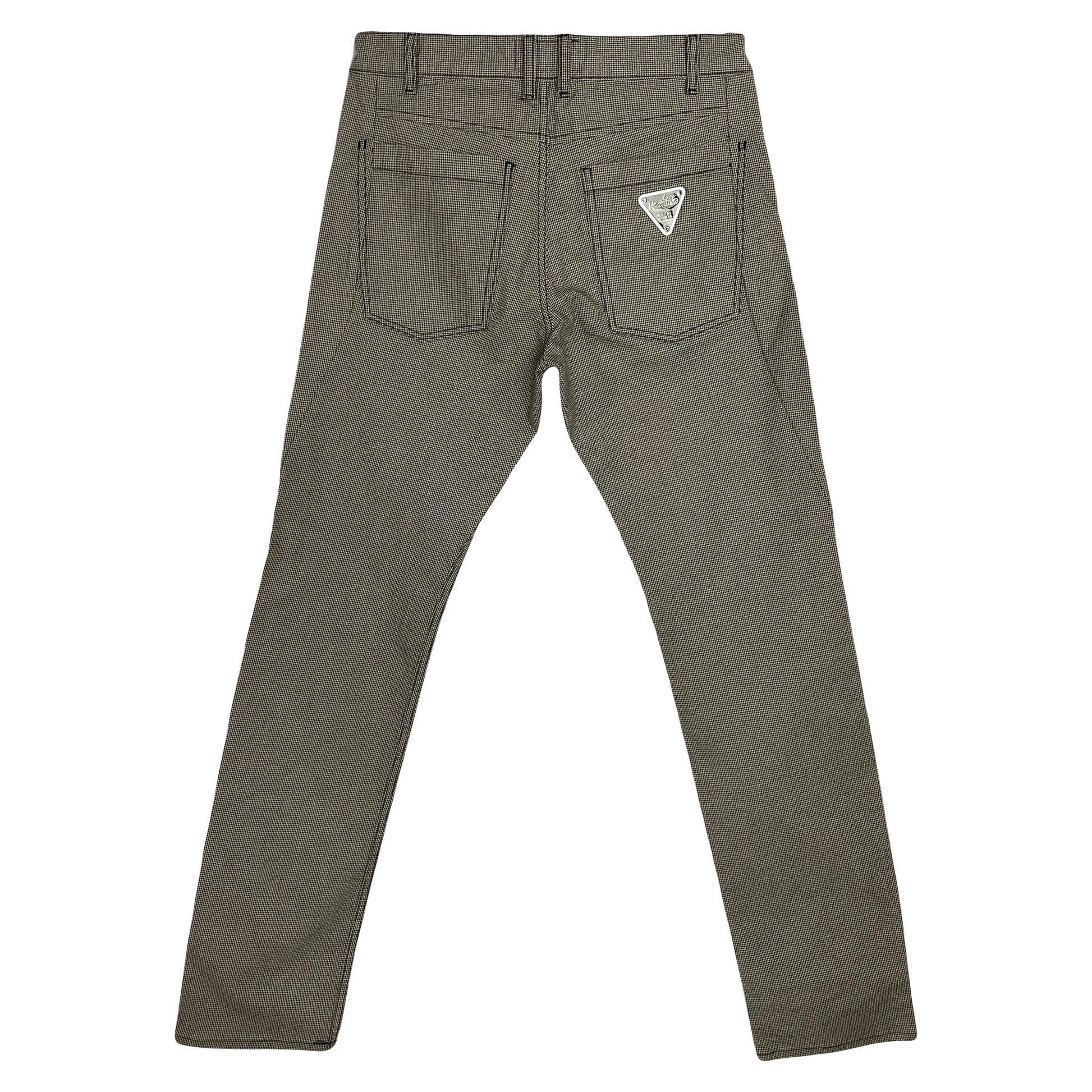 Pantaloni cinque tasche, chiusura con bottone e zip, passanti per cintura, gamba dritta, cuciture tono su tono.