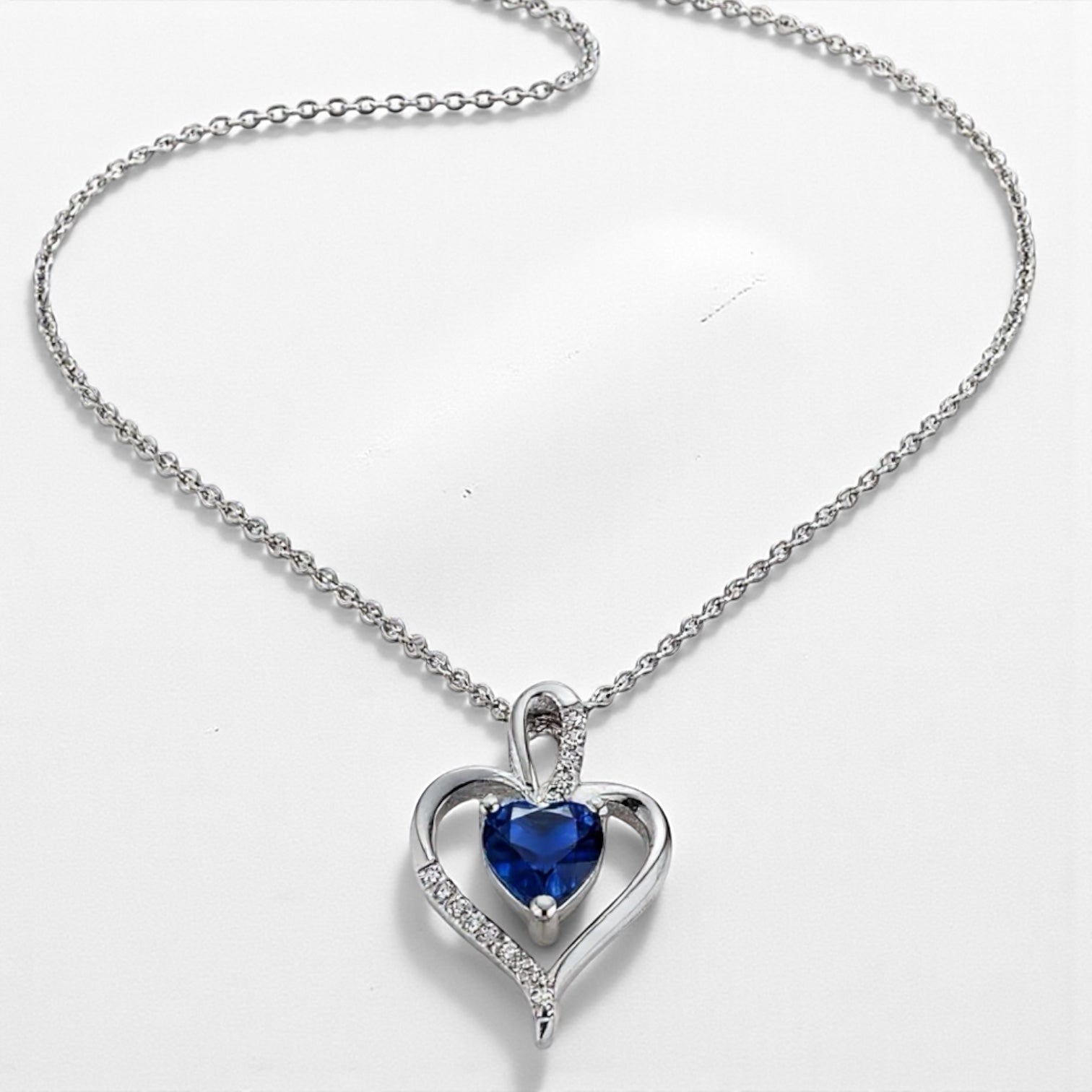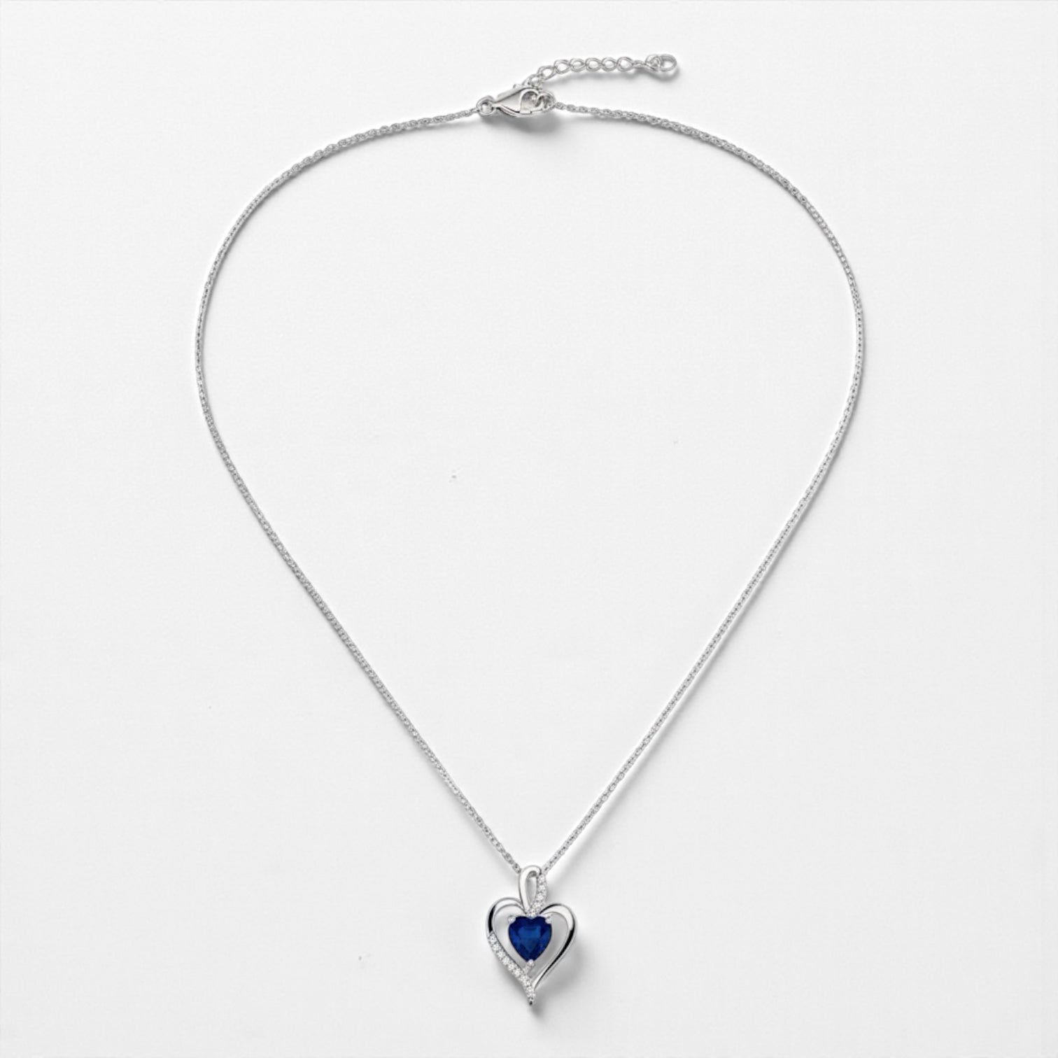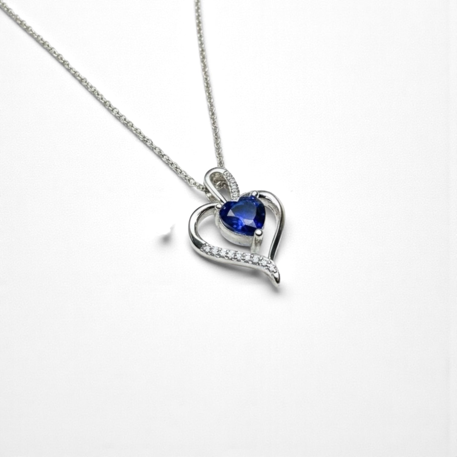 Collana da donna in argento con ciondolo a forma di cuore. Il pendente presenta una pietra centrale taglio cuore in tonalità blu intenso, incastonata in una montatura asimmetrica in argento. Il profilo del cuore è parzialmente impreziosito da piccoli cristalli trasparenti. Catena sottile con chiusura a moschettone e prolunga regolabile. Design elegante e romantico, ideale come regalo