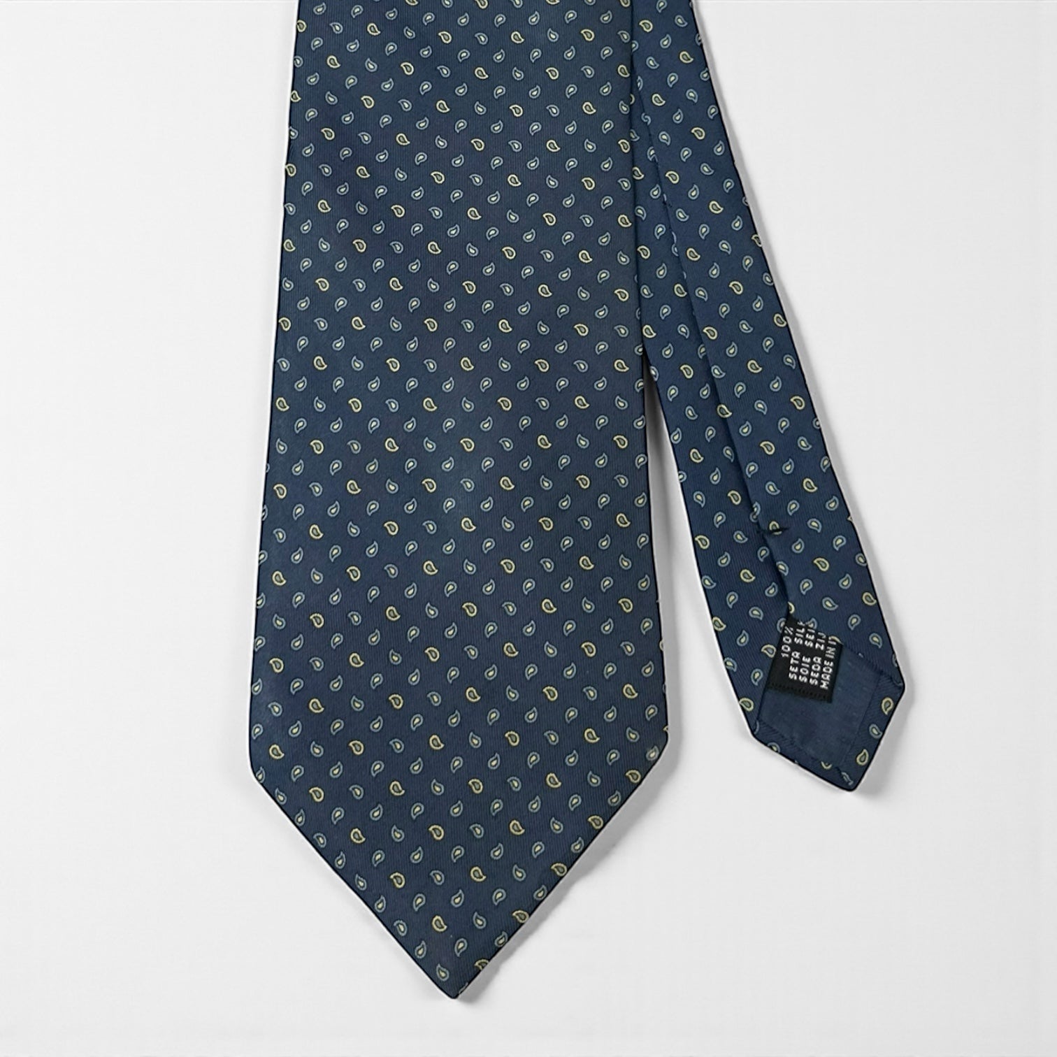 Cravatta in 100% seta dal taglio classico, con motivo paisley micro ripetuto. Design decorativo e struttura compatta. Etichetta cucita sul retro.