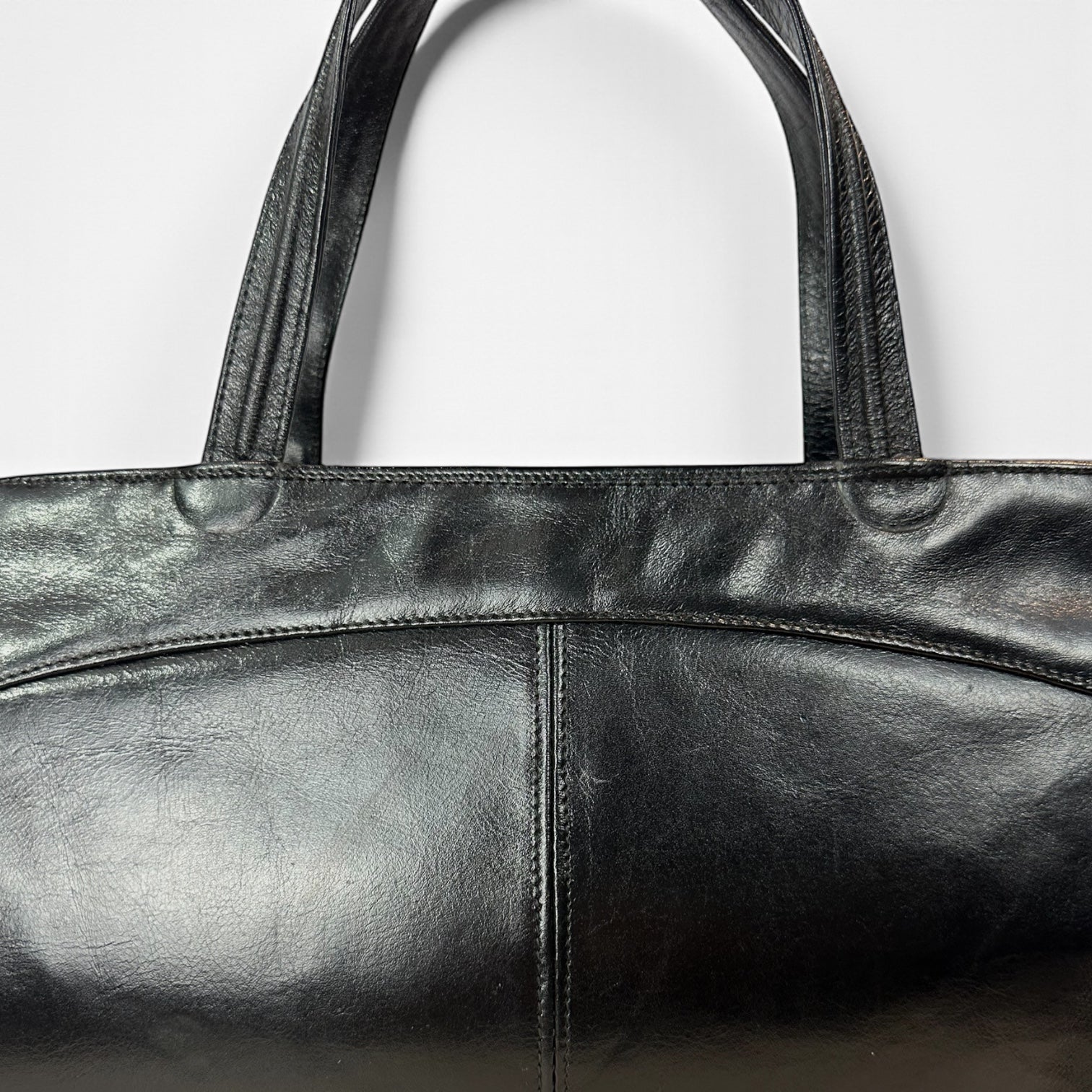 Borsa a mano in pelle nera lucida con struttura rigida.