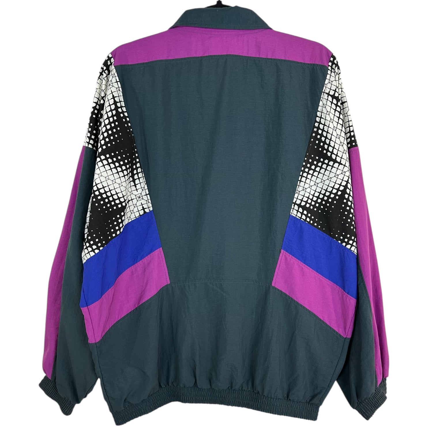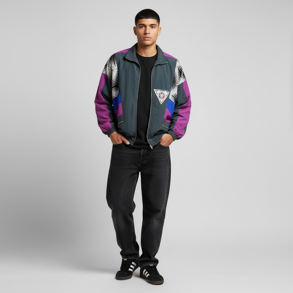 Giacca a vento con chiusura frontale a zip e vestibilità ampia. Modello in tessuto leggero con collo alto, maniche lunghe e fondo elasticizzato. Design multicolore con pannellature a contrasto nei toni del verde, viola, blu e nero. Motivo grafico sfumati sul petto e sulle maniche. Patch decorativo sul petto e grafica stilizzata.