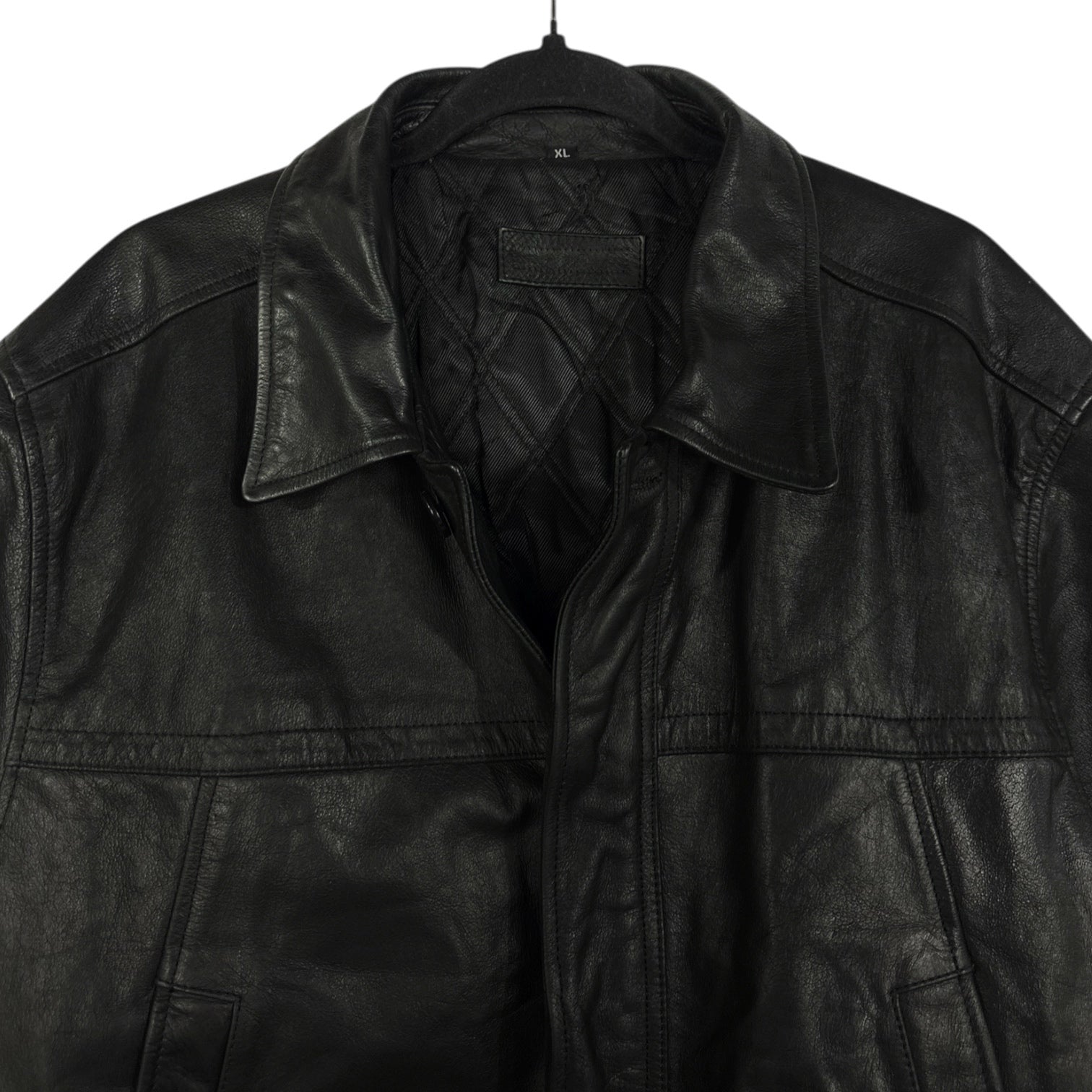 Giubbino in vera pelle nera. Chiusura frontale con bottoni. Colletto classico pieghevole. Due tasche verticali sul petto e due tasche inferiori con patta. Polsini con bottone. Interno foderato con motivo trapuntato a rombi. Finitura liscia e leggermente lucida.