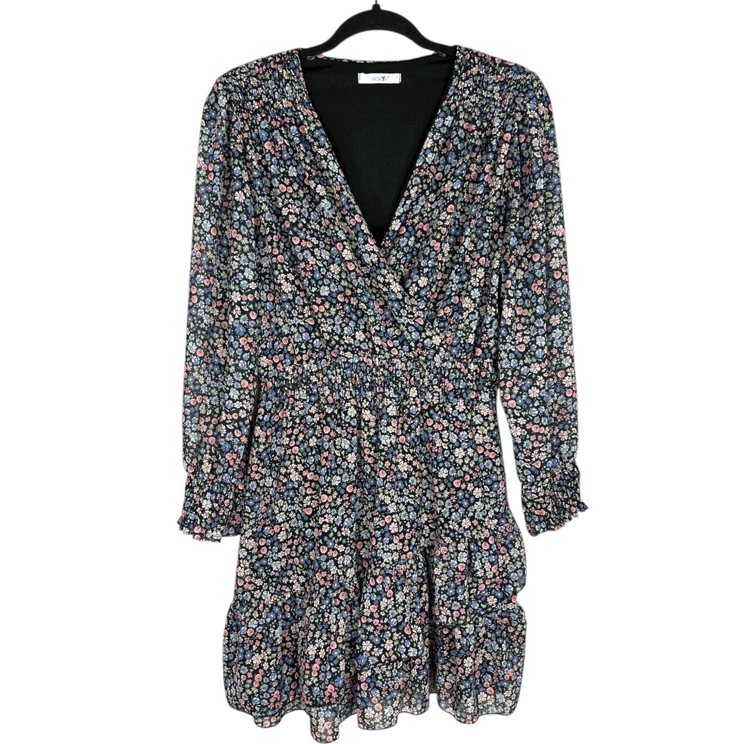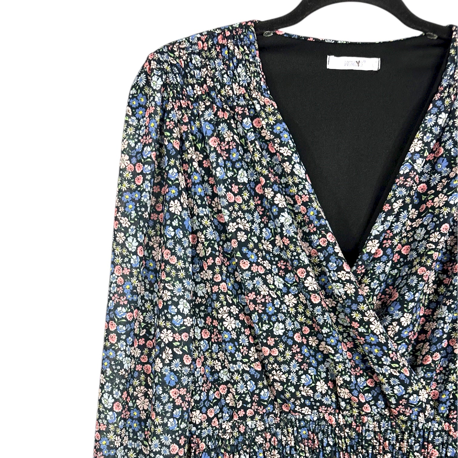 Vestito a fiori con fondo scuro e stampa floreale multicolore. Modello a maniche lunghe con polsini arricciati. Scollo a V e corpino con arricciature sulle spalle. Vita elasticizzata. Gonna leggermente svasata con balza finale.