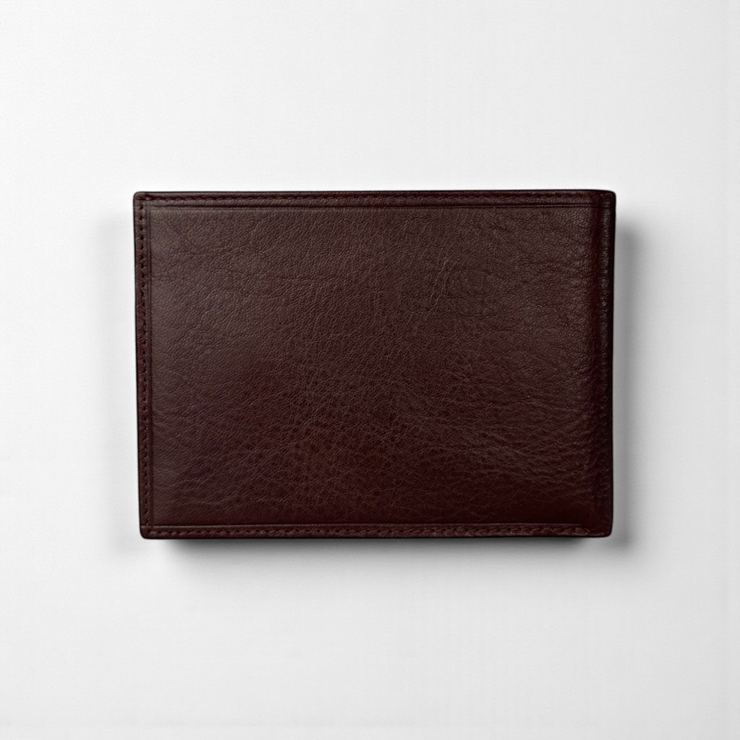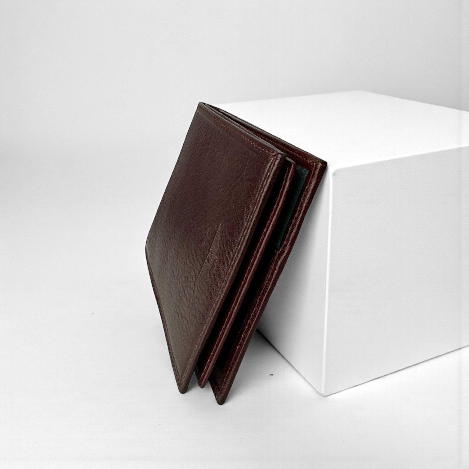 Portafoglio compatto in vera pelle martellata marrone, con struttura pieghevole e profili rifiniti. L’interno è foderato in tessuto grigio con stampa diagonale. Presenta due scomparti principali: uno con chiusura a bottone a pressione, l’altro aperto per accesso rapido.