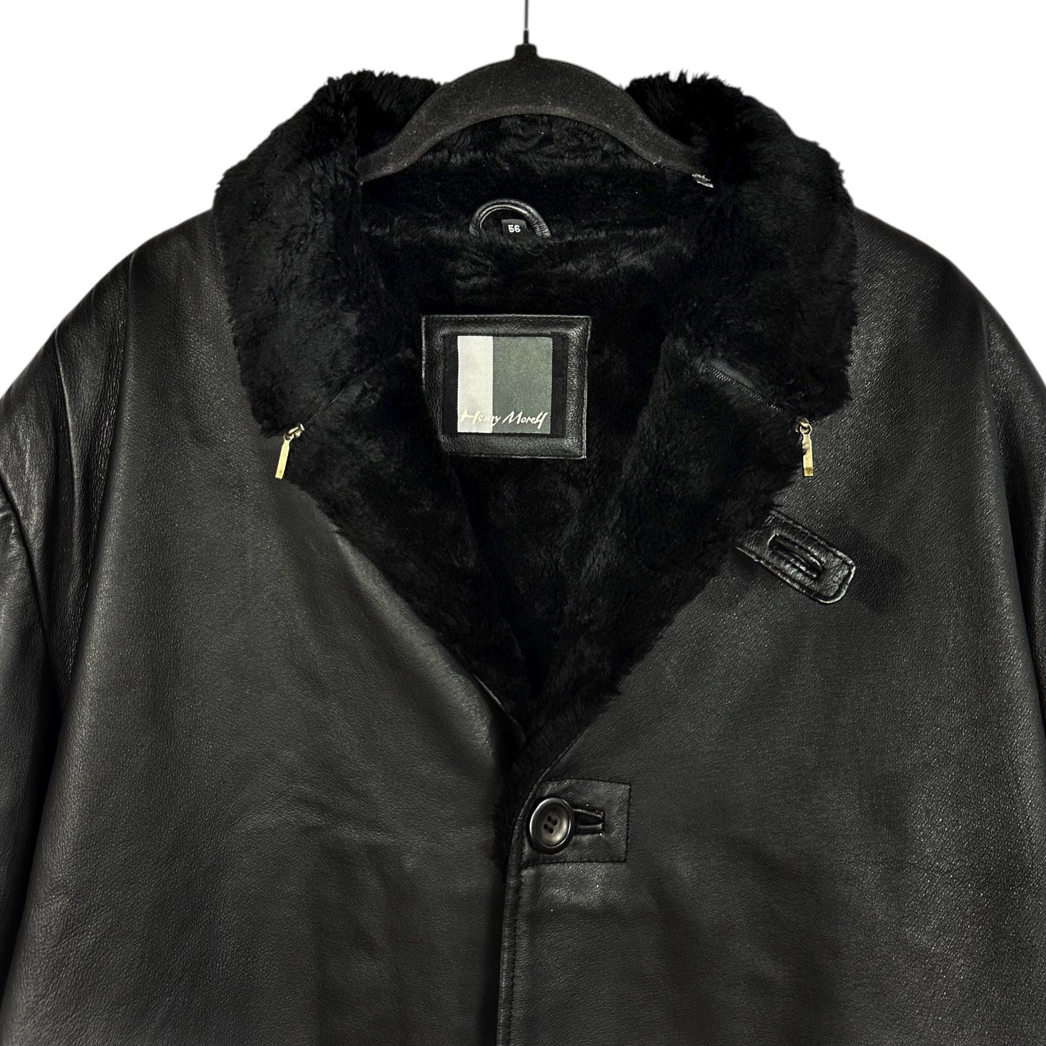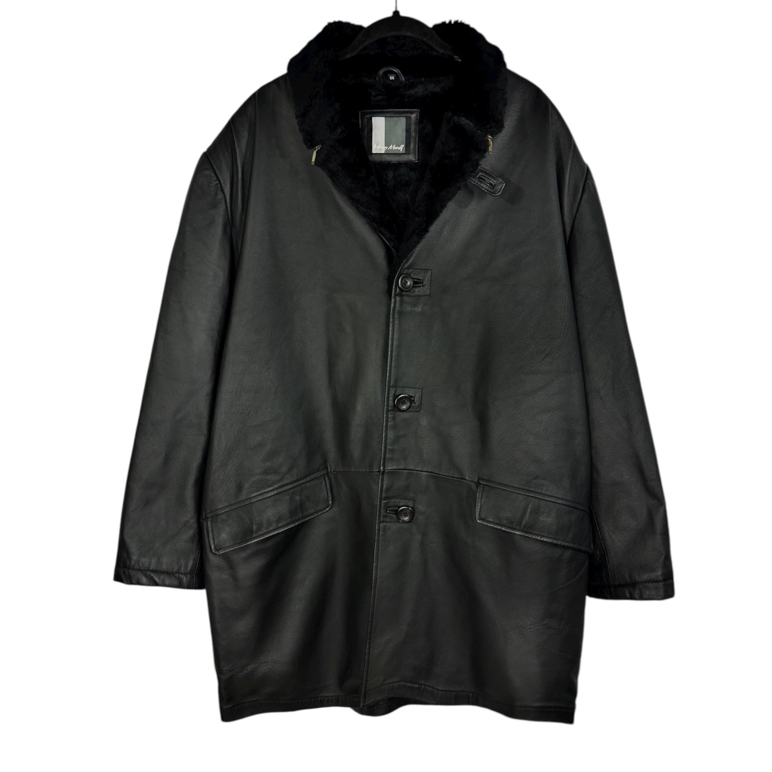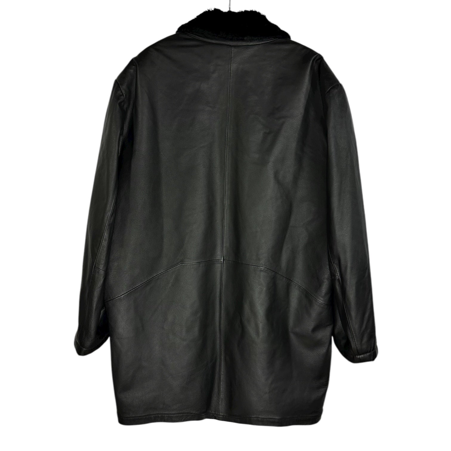 Cappotto in vera pelle nera, modello strutturato con chiusura frontale a bottoni. Collo in pelliccia sintetica nera con cinturino di fissaggio. Interno foderato in pelliccia sintetica, con zip laterali. Due tasche frontali con patta.