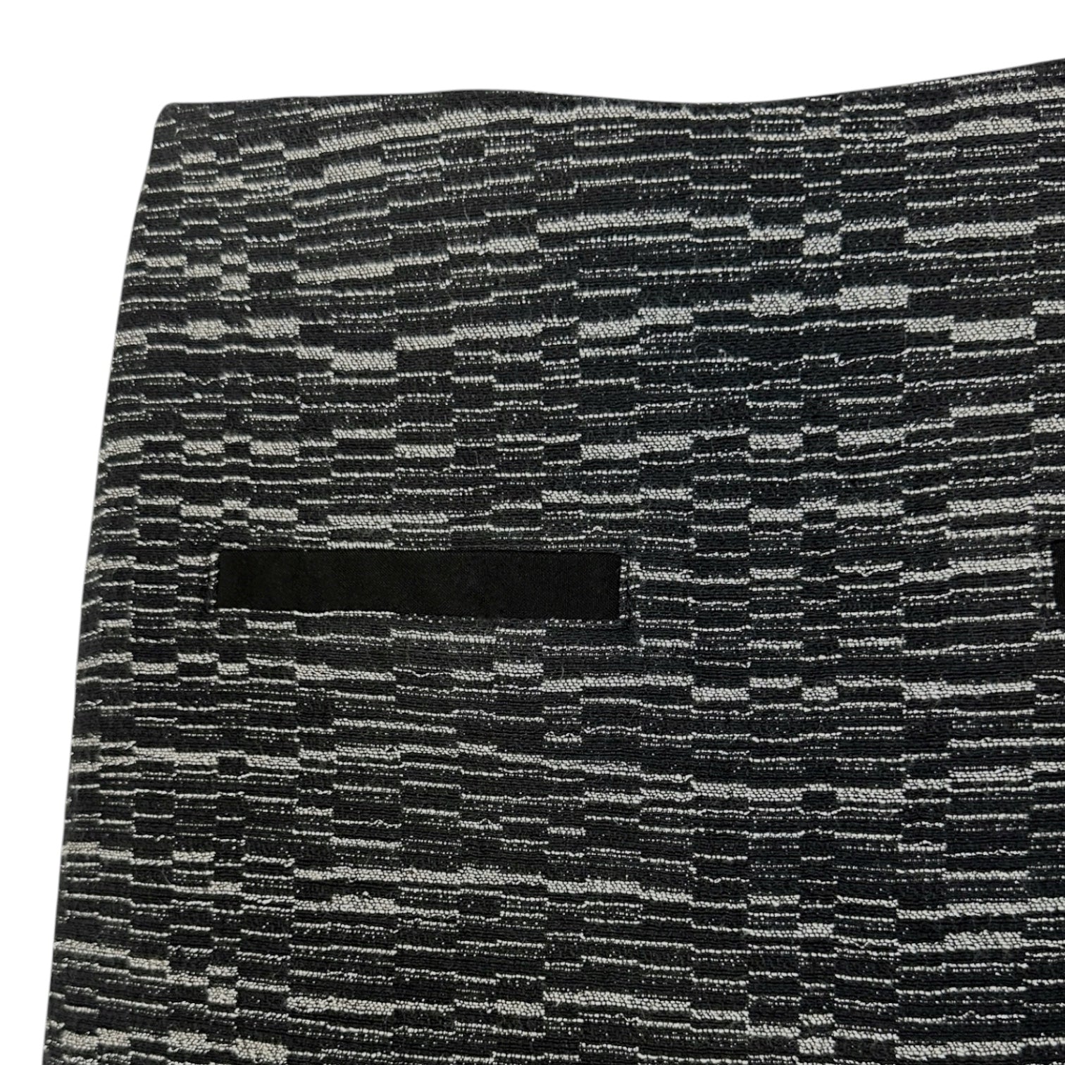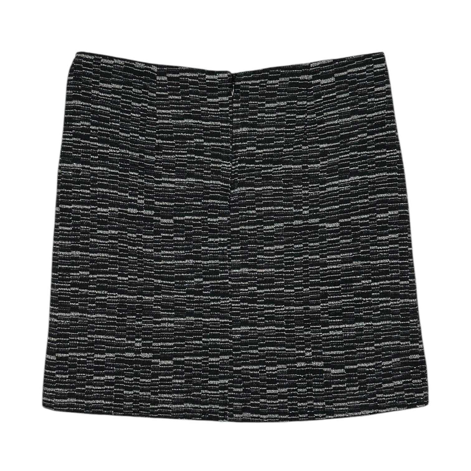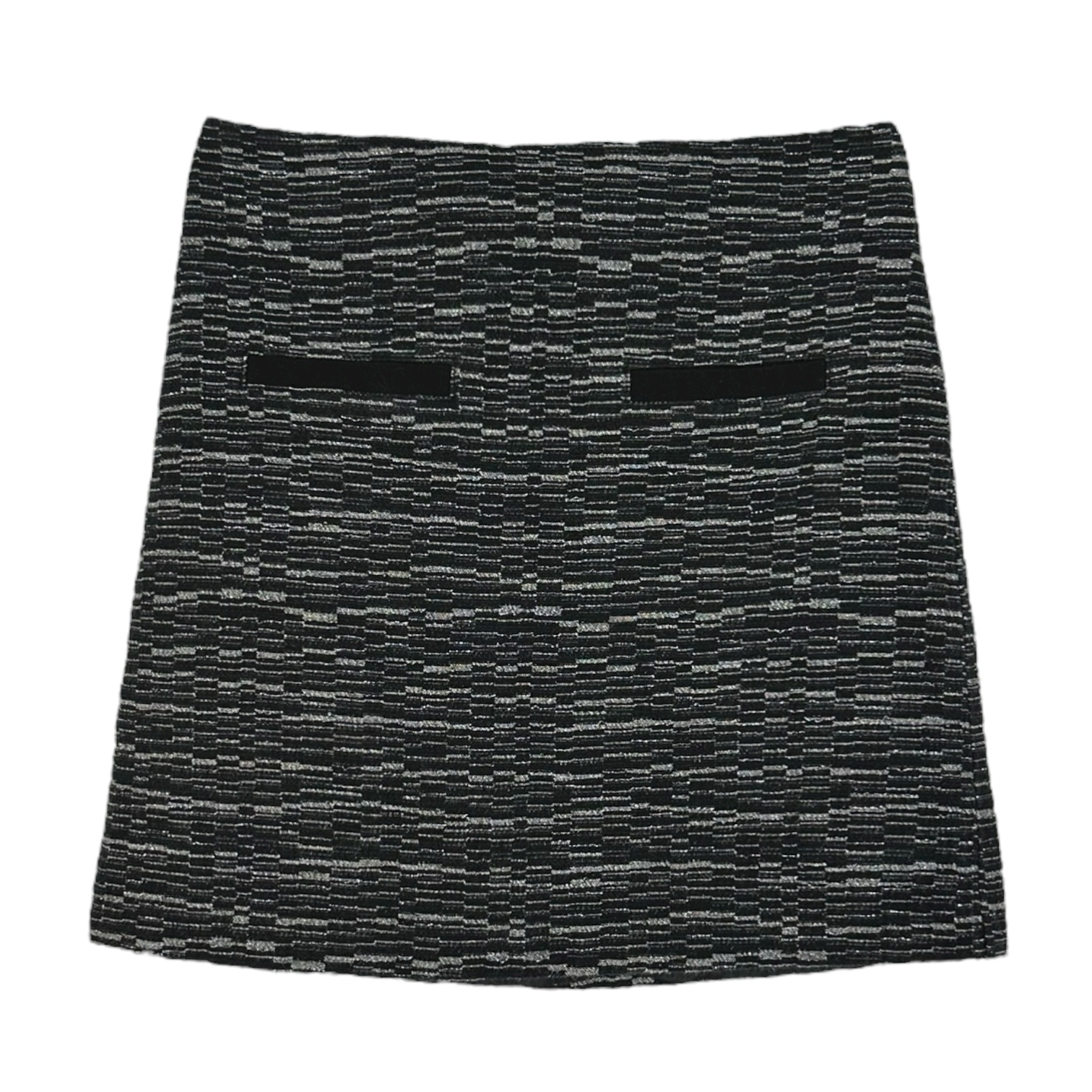 Gonna corta con motivo a righe orizzontali in bianco e nero. Modello dritto con tasche finte frontali a filetto.